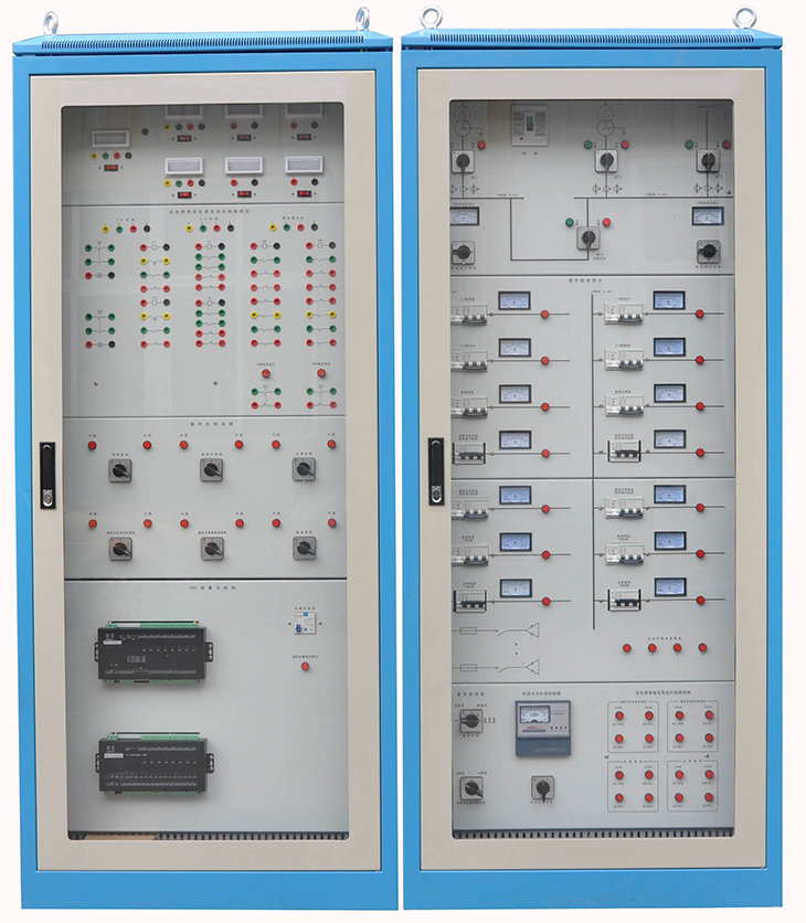 采用操作控制屏加控制柜的方式,均為固定式結(jié)構(gòu),操作控制屏為實(shí)訓(xùn)一次線路,從上到下依次為總降變電所、低壓配電所及建筑用電負(fù)荷,控制柜為二次控制回路,裝有備用電源自動(dòng)投入裝置、儀表、無(wú)功自動(dòng)補(bǔ)償控制器、常規(guī)繼電器等。