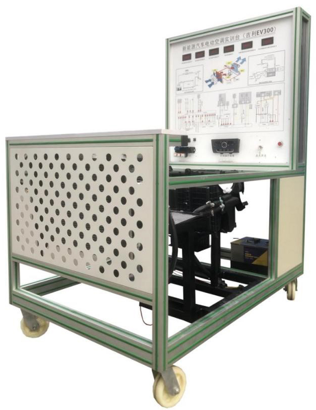 點火開關(guān)、電動汽車空調(diào)壓縮機、膨脹閥總成、干燥器總成、鼓風(fēng)機總成、冷凝器、冷卻電子風(fēng)扇、電動空調(diào)壓縮機控制器總成、空調(diào)蒸發(fā)箱總成、充電器與充電接口、充電插線、DC-DC轉(zhuǎn)換器、鋰電池組、空調(diào)操作面板、高低壓空調(diào)壓力表、采暖模塊總成、電源總開關(guān)、急停開關(guān)、直流接觸器、輔助蓄電池(12V45AH)、一體化全鋁合金型材搭建的移動臺架(1500×1000×1700mm ,帶自鎖腳輪裝置,帶安裝檢測端子的原理面板948×898mm)、故障模擬與排除裝置、設(shè)備操作說明書。