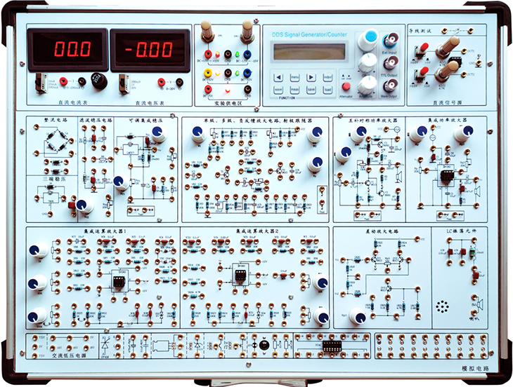 含機(jī)箱、工作電源、常用模擬信號(hào)源、實(shí)驗(yàn)電路區(qū)和分立元件 |