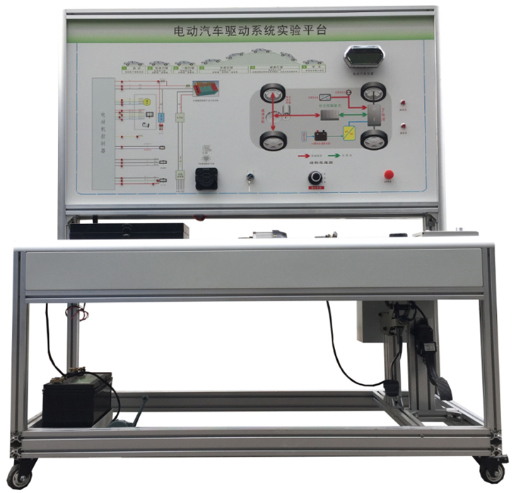 檢測控制面板(裝有各種檢測端子,1448×940mm彩色電路圖和工作原理示意圖)、組合儀表、點(diǎn)火開關(guān)、電機(jī)控制器、車載充電器與充電接口、DC-DC轉(zhuǎn)換器、鋰動(dòng)力電池組、電動(dòng)車電機(jī)(直流無刷電機(jī))與變速箱、后輪左右液壓制動(dòng)裝置、驅(qū)動(dòng)橋傳動(dòng)裝置、剎車開關(guān)、檔位開關(guān)、油門控制裝置、大電流繼電器、電源總開關(guān)、急停開關(guān)、輔助蓄電池(12V45AH)、一體化全鋁合金型材搭建的移動(dòng)臺(tái)架(1500×700×1700mm (帶自鎖腳輪裝置,帶安裝檢測端子的原理面板,面板1448×940mm)、故障考核系統(tǒng)、設(shè)備操作說明書。