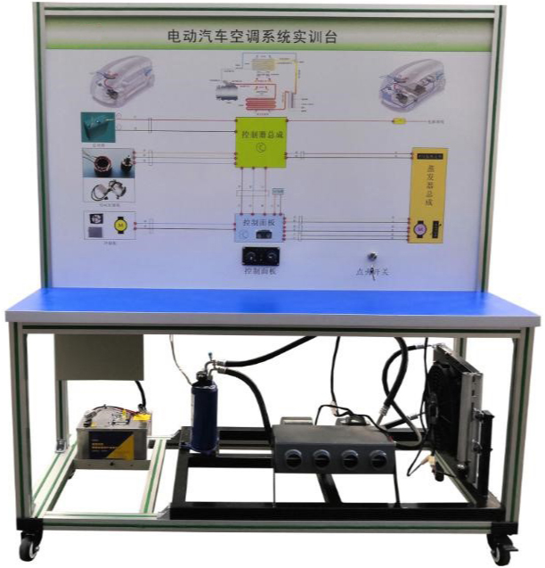 點(diǎn)火開關(guān)、電動(dòng)汽車空調(diào)壓縮機(jī)、膨脹閥總成、干燥器總成、鼓風(fēng)機(jī)總成、冷凝器、冷卻電子風(fēng)扇、電動(dòng)空調(diào)壓縮機(jī)控制器總成、空調(diào)蒸發(fā)箱總成、充電器與充電接口、充電插線、DC-DC轉(zhuǎn)換器、鋰電池組、空調(diào)操作面板、高低壓空調(diào)壓力表、采暖模塊總成、電源總開關(guān)、急停開關(guān)、直流接觸器、輔助蓄電池(12V45AH)、一體化全鋁合金型材搭建的移動(dòng)臺(tái)架(1500×700×1700mm 帶自鎖腳輪裝置,帶安裝檢測(cè)端子的原理面板,面板1448×940mm)、故障模擬與排除裝置、設(shè)備操作說明書。