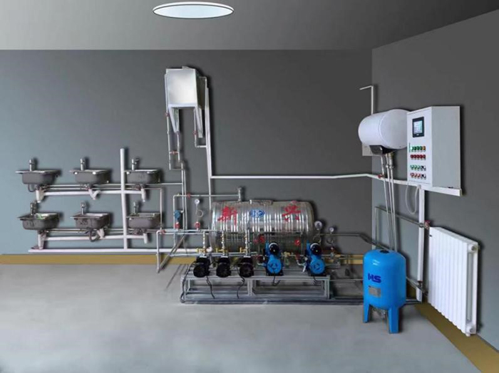 1、生活給水系統(tǒng):主要有給水箱、給水泵、給水管道、壓力變送器、脈沖水表、水龍頭和淋浴頭等組成。管路采用不銹鋼管進行設計,可進行不銹鋼管的切割、安裝和通水試驗操作,通過控制系統(tǒng)可實現(xiàn)生活給水系統(tǒng)的變頻恒壓供水功能,實現(xiàn)單泵變頻控制或雙泵切換控制等功能;通過脈沖式水表可以完成用水量的計量。