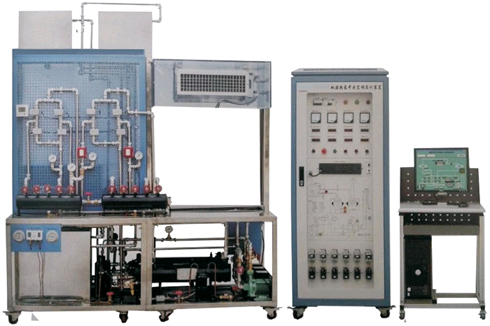 空氣調(diào)節(jié)系統(tǒng)由、模擬房間、風(fēng)機(jī)盤管、中央空調(diào)控制器、閥門,一臺水泵、不銹鋼換熱器組等組成,主要完成空氣調(diào)節(jié)作用。(室內(nèi)送風(fēng)風(fēng)機(jī)轉(zhuǎn)速可調(diào)),主要完成制冷機(jī)組冷卻熱交換,為室內(nèi)提供適當(dāng)?shù)臏囟?/span>