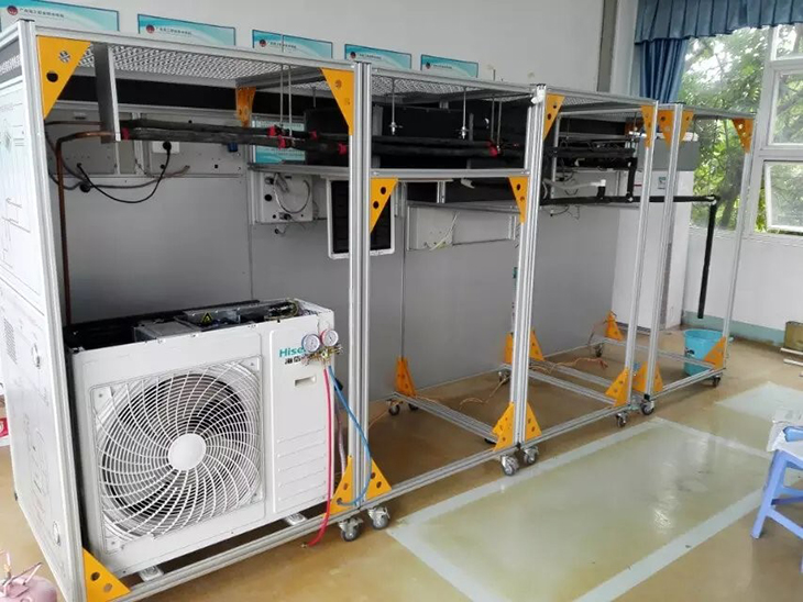 實訓裝置采用移動框架4040鋁型材結構,安裝好后可固定位置,防止移動而牽動制冷系統(tǒng)管路。整個模擬房頂采用1.5MM的網(wǎng)多功能網(wǎng)孔板設計使用專業(yè)家用中央空調(diào)專用吊架。掛壁式后安裝板同樣也采用的網(wǎng)多功能網(wǎng)孔板設計.