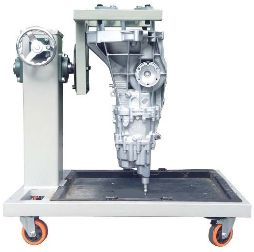 采用減速翻轉(zhuǎn)機構(gòu),可使變速器旋轉(zhuǎn)任意角度,并能任意位置鎖止,便于學(xué)生從不同的角度進行拆卸和裝配。