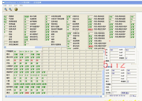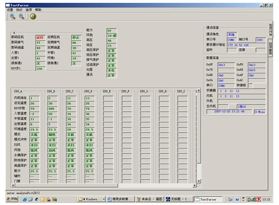 中央空調(diào)機由于工程復(fù)雜,設(shè)備分散,有的已經(jīng)裝修在開花板上測試程序,一但出現(xiàn)了故障,工程量相當(dāng)大,為了能夠快速準(zhǔn)確地測出故障是由主機機組還是室內(nèi)機的故障的,每個生產(chǎn)廠家根據(jù)生產(chǎn)的和維修的需要而開發(fā)了中央空調(diào)測試程序?蓽y試壓縮機的運轉(zhuǎn)頻率,傳感器的各種數(shù)據(jù),電子膨脹閥的工作步數(shù)等幾十種中央空調(diào)的工作數(shù)據(jù)和狀態(tài),軟件可實現(xiàn)對內(nèi)機的控制,,可以對1-64臺內(nèi)機的狀態(tài)進行設(shè)定。是高校提供了好的研究的學(xué)習(xí)設(shè)備。