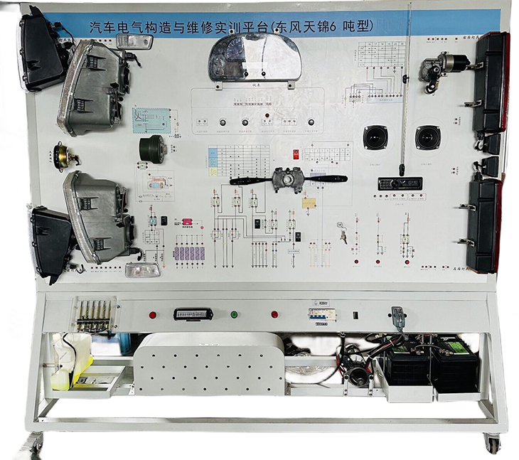 該設備采用全新東風天錦6 噸型柴油機整車電器實物為基礎,充分展示汽車儀表系統(tǒng)、燈光系統(tǒng)、雨刮系統(tǒng)、喇叭系統(tǒng)、發(fā)動機電器系統(tǒng)、起動系統(tǒng)和充電系統(tǒng)等汽車電器各系統(tǒng)的組成結(jié)構(gòu)和工作過程。適用于學校對整車電器理論和維修實訓的教學需要。
