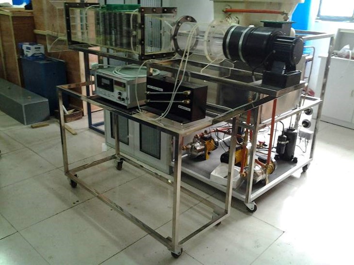 多翼式低噪音風(fēng)機(jī),自動調(diào)節(jié)風(fēng)門,組合式有機(jī)玻璃風(fēng)洞,翅片加熱管,加熱由固體調(diào)壓模塊配電位器調(diào)節(jié)加熱功率,數(shù)顯電流表、電壓表,翅片管簇順排和叉排組合,溫度傳感器,畢托管配差壓傳感器測量風(fēng)量,16路萬能信號輸入巡檢儀顯示溫度、阻力、流量,不銹鋼支架。